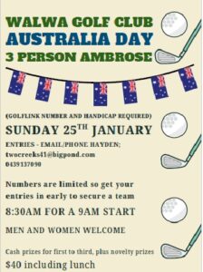 The Walwa Golf Club will host its annual Australia Day 3 Person Ambrose on Sunday 25 January 2026. This is a great event and a...